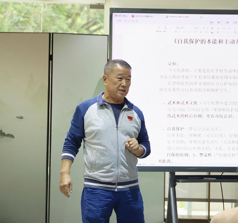 活动伊始,王建华教授结合自身多年的教学与武术研究经验,从“武术与武术文化”谈起,强调传统武术中“养防结合、内外兼修”的理念对现代人的现实启示。讲座中,王教授以生动的实例剖析了常见的生活安全隐患,并通过现场演示,为老师们讲解了如何在突发情境中进行自我防护与应急反应。